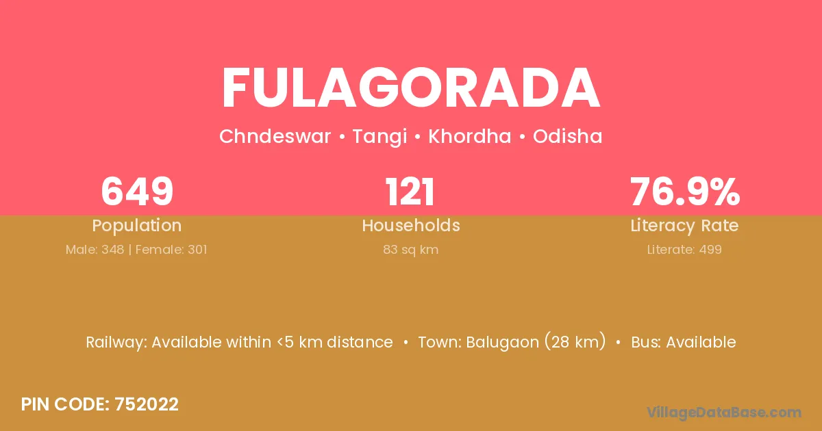 Balugaon (28 km) is the nearest town to Fulagorada village for major economic activities and is located approximately 28 km away.