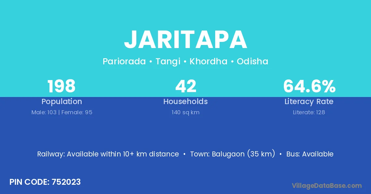 Balugaon (35 km) is the nearest town to Jaritapa village for major economic activities and is located approximately 35 km away.