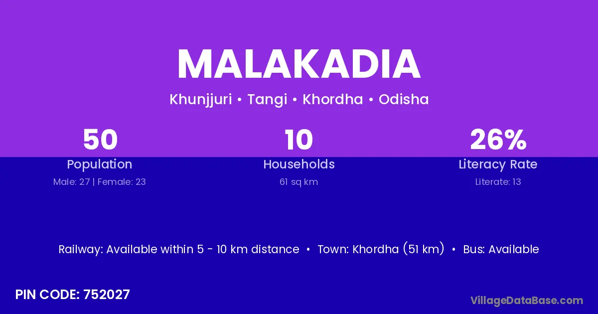 Khordha (51 km) is the nearest town to Malakadia village for major economic activities and is located approximately 51 km away.