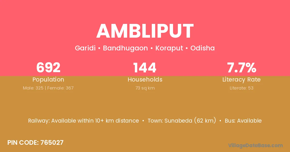 Sunabeda (62 km) is the nearest town to Ambliput village for major economic activities and is located approximately 62 km away.