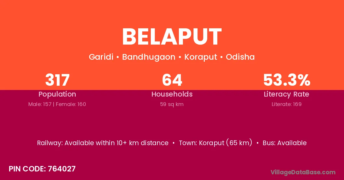 Koraput (65 km) is the nearest town to Belaput village for major economic activities and is located approximately 65 km away.