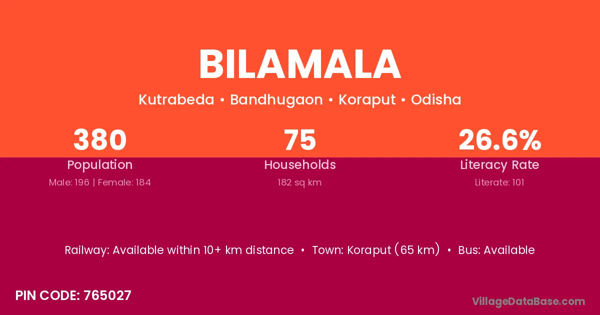Koraput (65 km) is the nearest town to Bilamala village for major economic activities and is located approximately 65 km away.