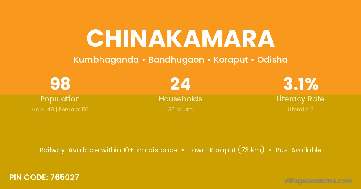Koraput (73 km) is the nearest town to Chinakamara village for major economic activities and is located approximately 73 km away.