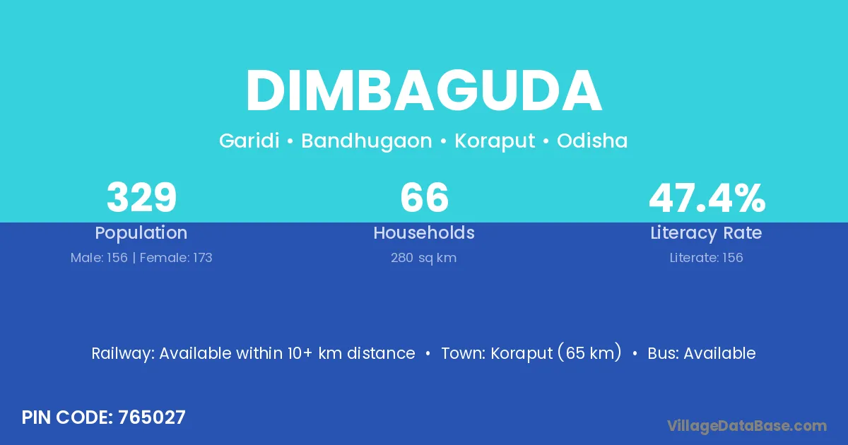 Koraput (65 km) is the nearest town to Dimbaguda village for major economic activities and is located approximately 65 km away.