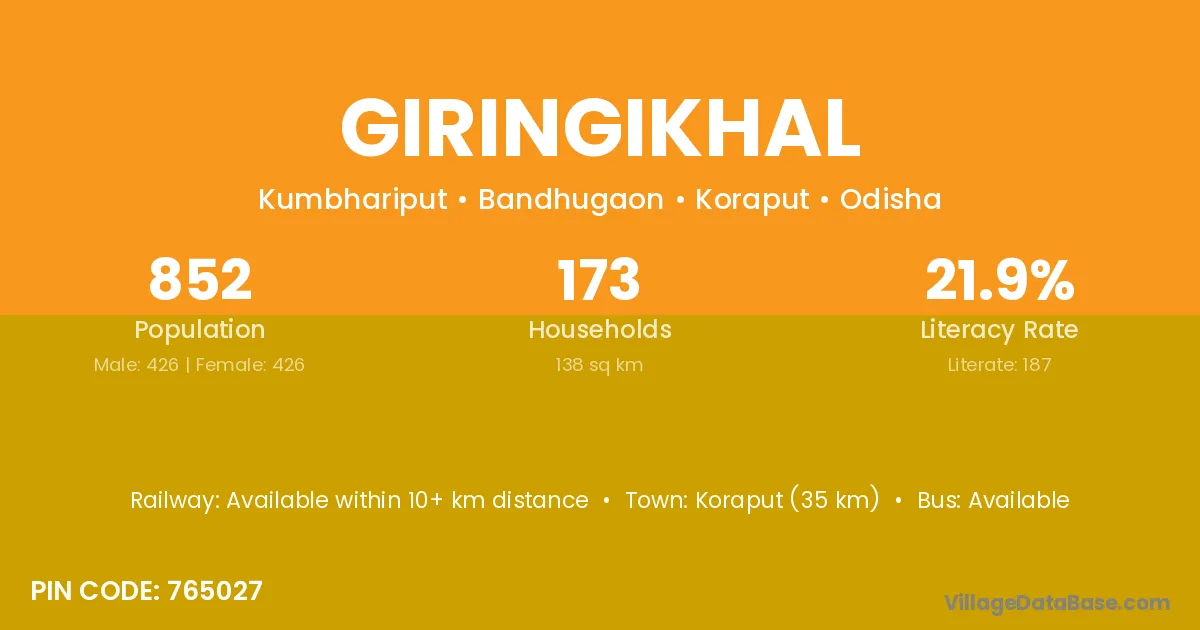 Giringikhal village has a total population of 852 people, of which 426 are males and 426 are females.