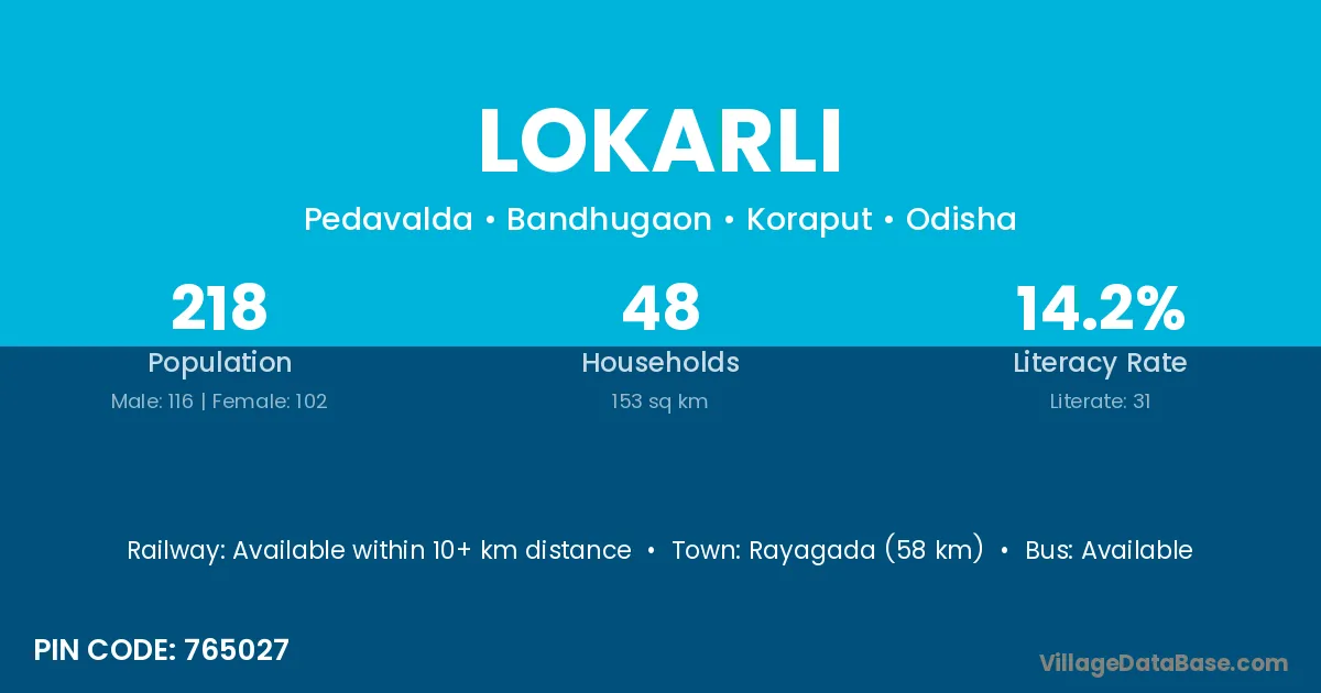 Rayagada (58 km) is the nearest town to Lokarli village for major economic activities and is located approximately 58 km away.
