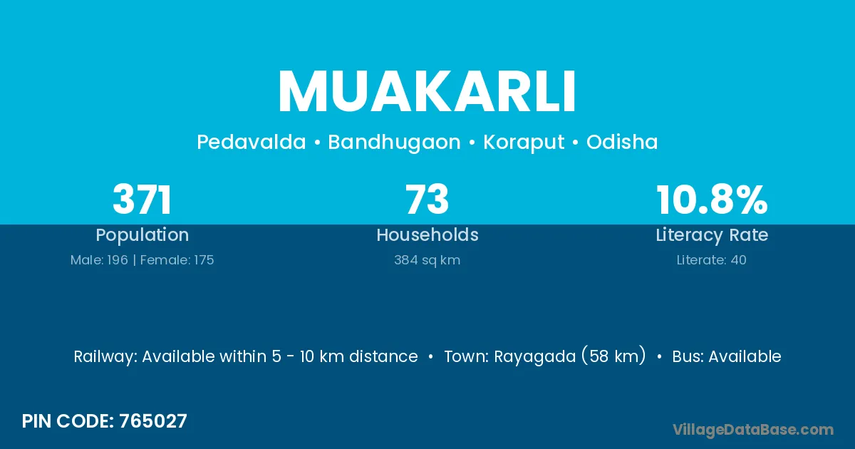 Rayagada (58 km) is the nearest town to Muakarli village for major economic activities and is located approximately 58 km away.
