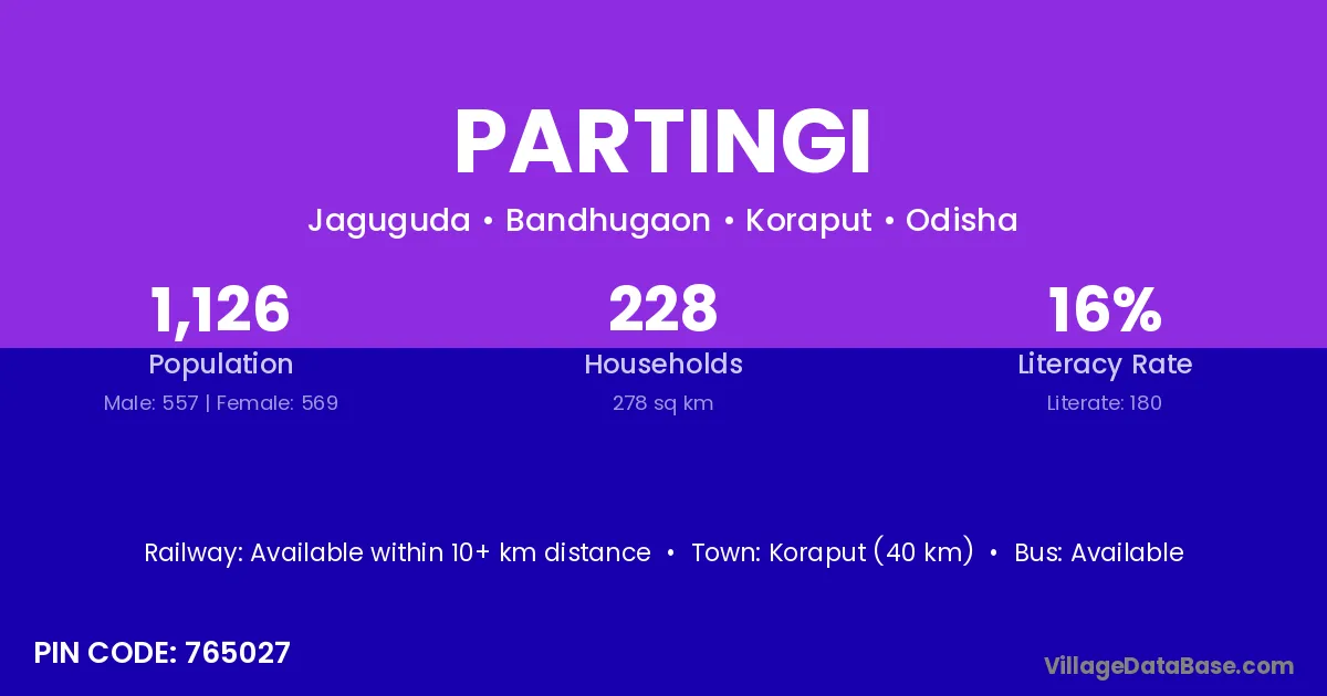 Koraput (40 km) is the nearest town to Partingi village for major economic activities and is located approximately 40 km away.
