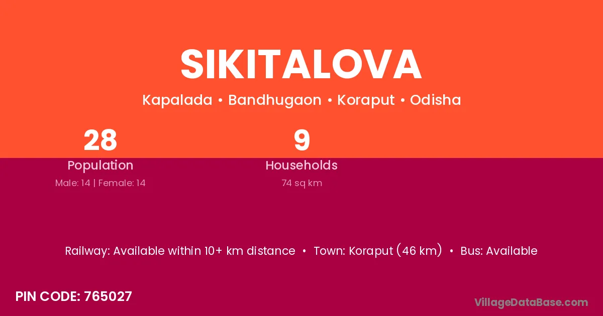 Koraput (46 km) is the nearest town to Sikitalova village for major economic activities and is located approximately 46 km away.