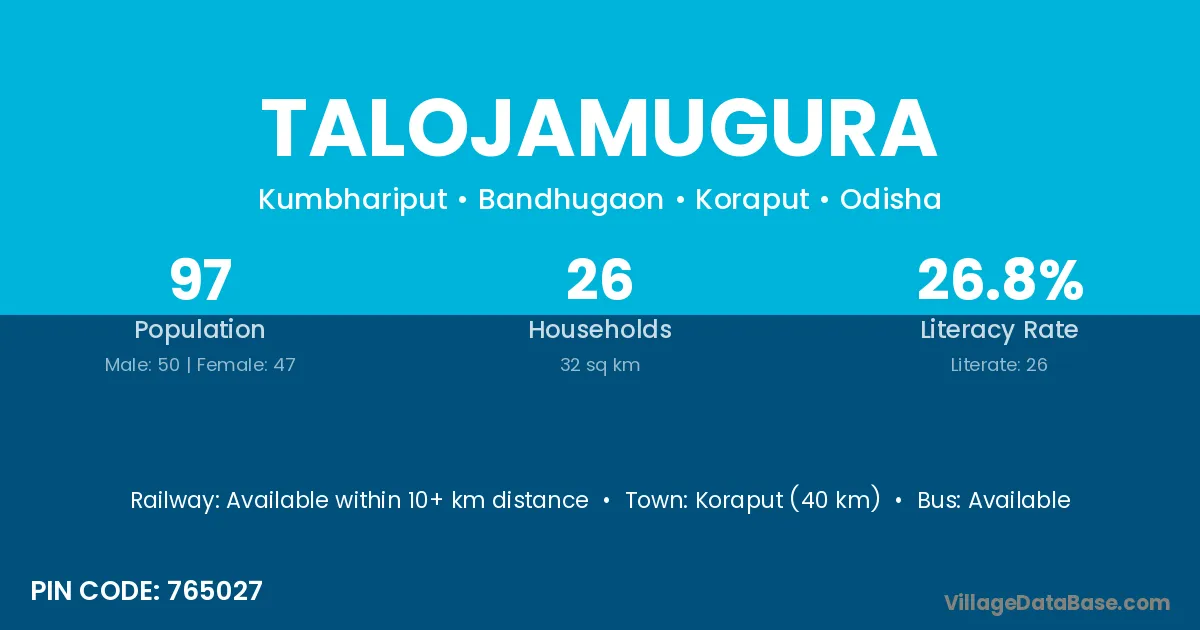 Koraput (40 km) is the nearest town to Talojamugura village for major economic activities and is located approximately 40 km away.