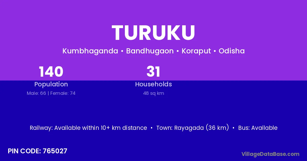 Rayagada (36 km) is the nearest town to Turuku village for major economic activities and is located approximately 36 km away.