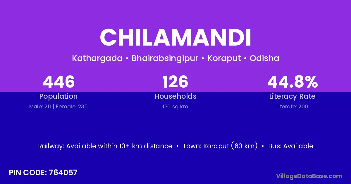 Koraput (60 km) is the nearest town to Chilamandi village for major economic activities and is located approximately 60 km away.
