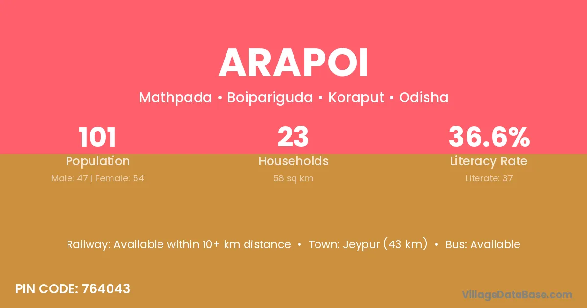 Jeypur (43 km) is the nearest town to Arapoi village for major economic activities and is located approximately 43 km away.