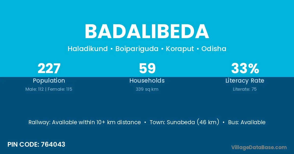 Sunabeda (46 km) is the nearest town to Badalibeda village for major economic activities and is located approximately 46 km away.