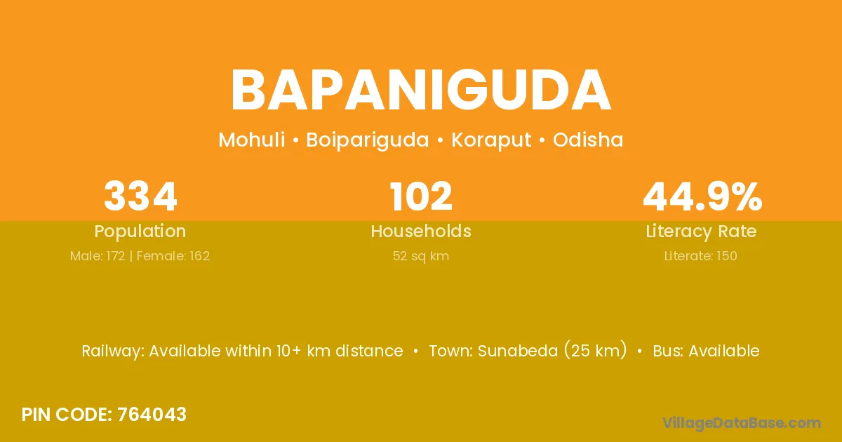 Sunabeda (25 km) is the nearest town to Bapaniguda village for major economic activities and is located approximately 25 km away.