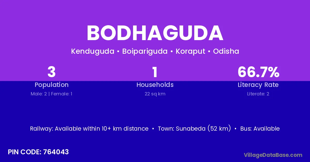 Bodhaguda village has a total population of 3 people, of which 2 are males and 1 are females.
