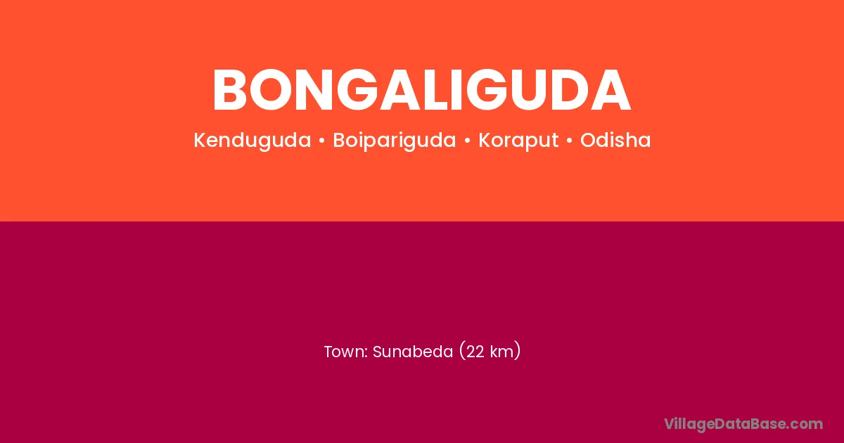Sunabeda (22 km) is the nearest town to Bongaliguda village for major economic activities and is located approximately 22 km away.