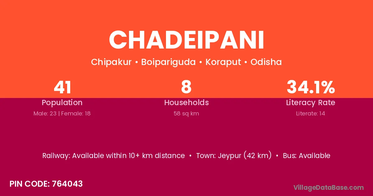 Jeypur (42 km) is the nearest town to Chadeipani village for major economic activities and is located approximately 42 km away.