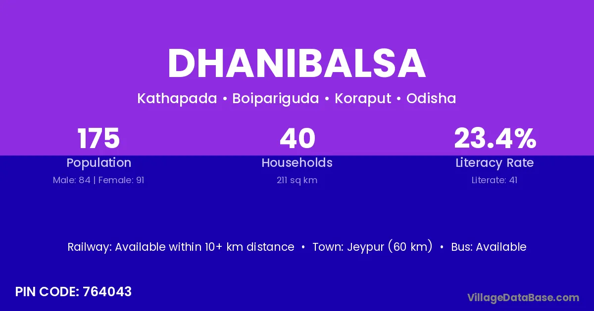 Jeypur (60 km) is the nearest town to Dhanibalsa village for major economic activities and is located approximately 60 km away.