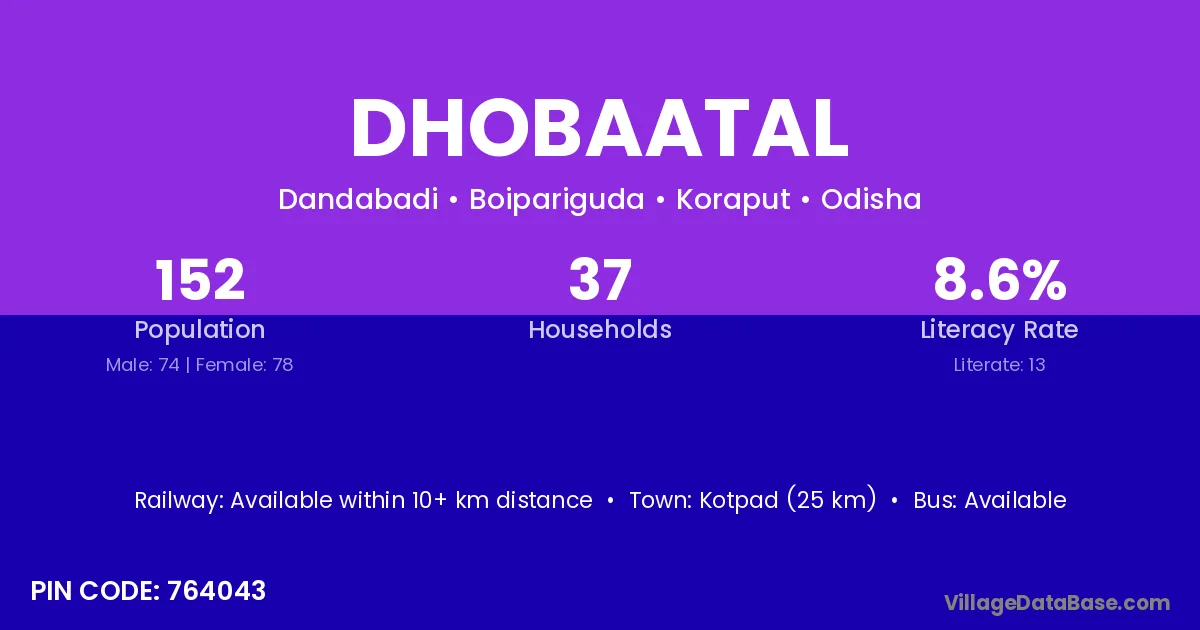 Kotpad (25 km) is the nearest town to Dhobaatal village for major economic activities and is located approximately 25 km away.