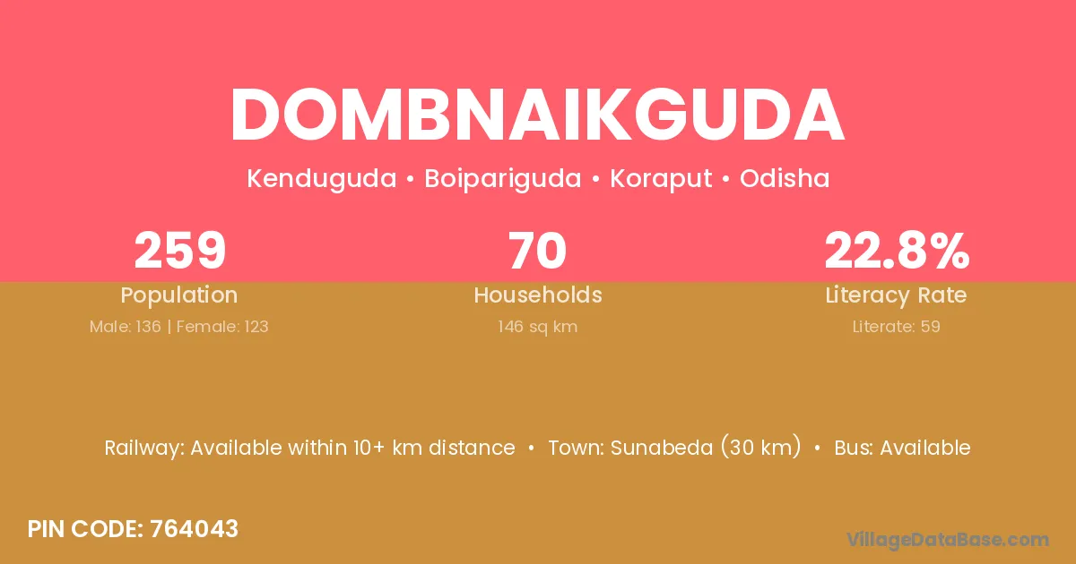 Sunabeda (30 km) is the nearest town to Dombnaikguda village for major economic activities and is located approximately 30 km away.