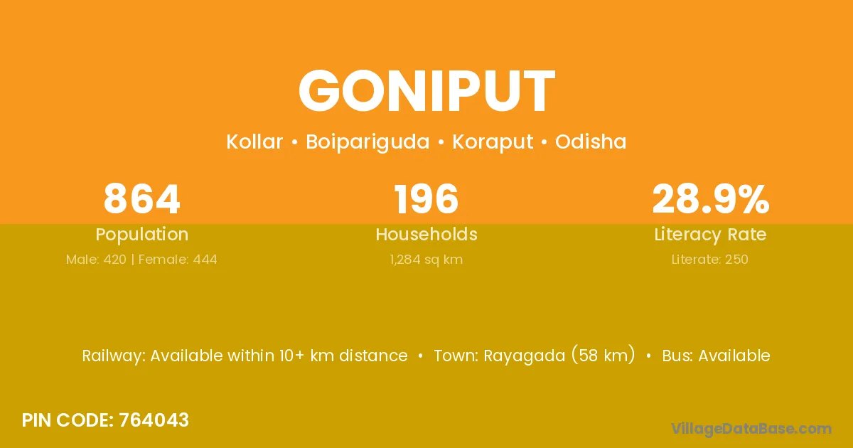 Rayagada (58 km) is the nearest town to Goniput village for major economic activities and is located approximately 58 km away.