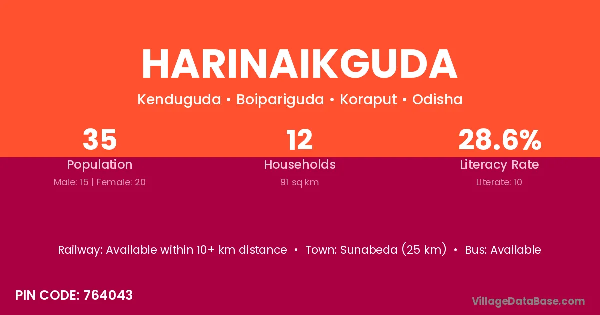 Sunabeda (25 km) is the nearest town to Harinaikguda village for major economic activities and is located approximately 25 km away.
