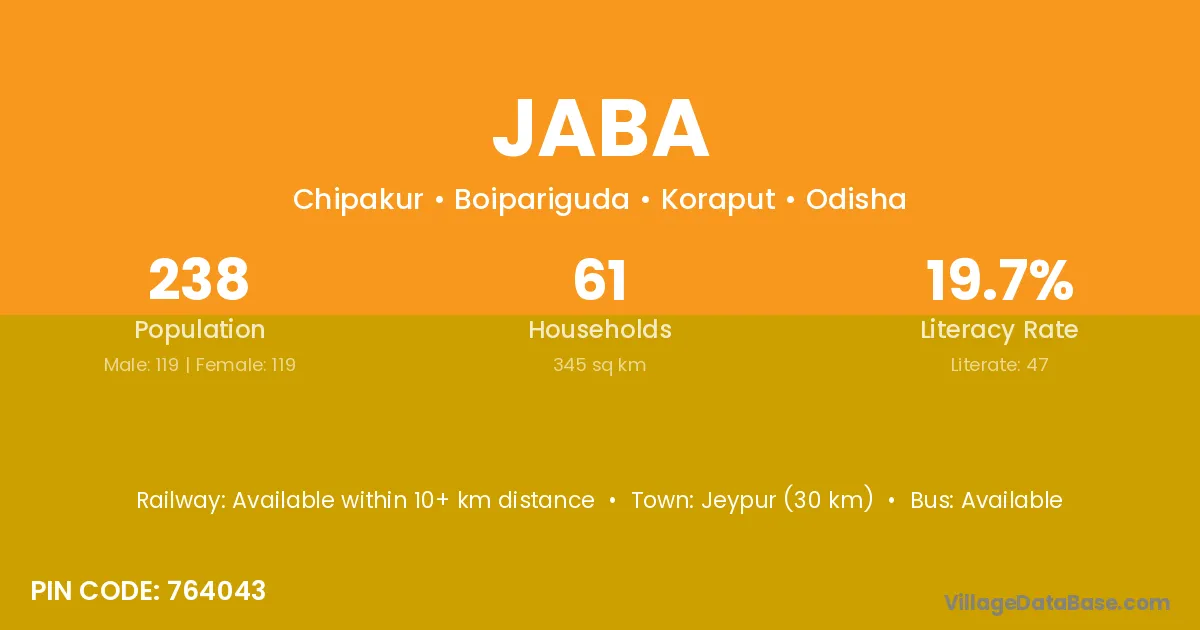 Jeypur (30 km) is the nearest town to Jaba village for major economic activities and is located approximately 30 km away.