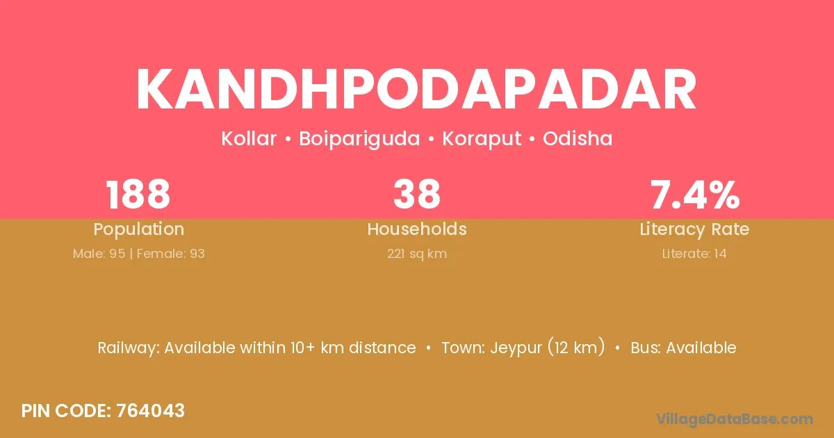 Jeypur (12 km) is the nearest town to Kandhpodapadar village for major economic activities and is located approximately 12 km away.
