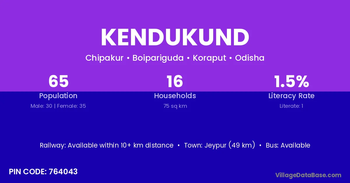 Jeypur (49 km) is the nearest town to Kendukund village for major economic activities and is located approximately 49 km away.