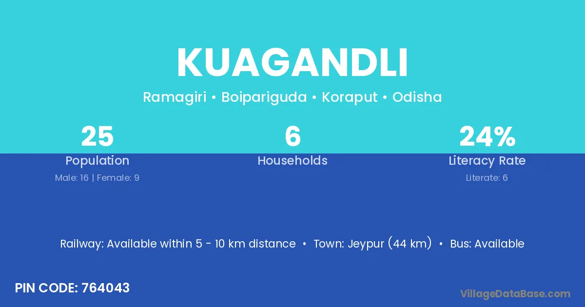 Jeypur (44 km) is the nearest town to Kuagandli village for major economic activities and is located approximately 44 km away.