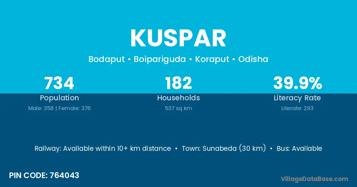 Sunabeda (30 km) is the nearest town to Kuspar village for major economic activities and is located approximately 30 km away.