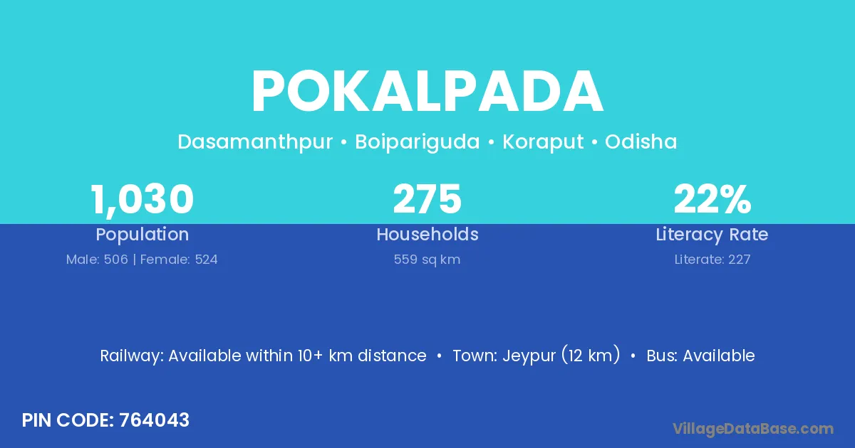 Jeypur (12 km) is the nearest town to Pokalpada village for major economic activities and is located approximately 12 km away.