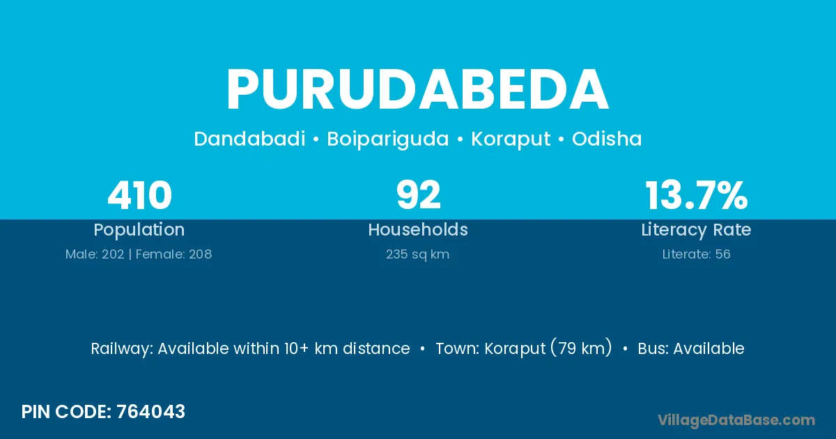 Koraput (79 km) is the nearest town to Purudabeda village for major economic activities and is located approximately 79 km away.