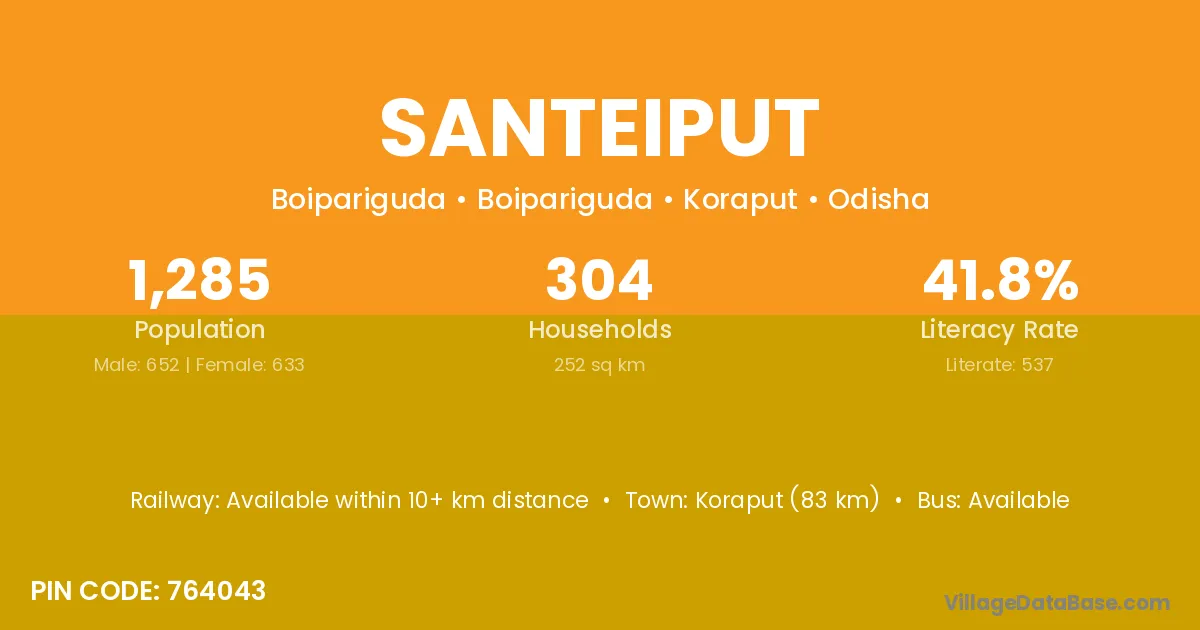 Koraput (83 km) is the nearest town to Santeiput village for major economic activities and is located approximately 83 km away.