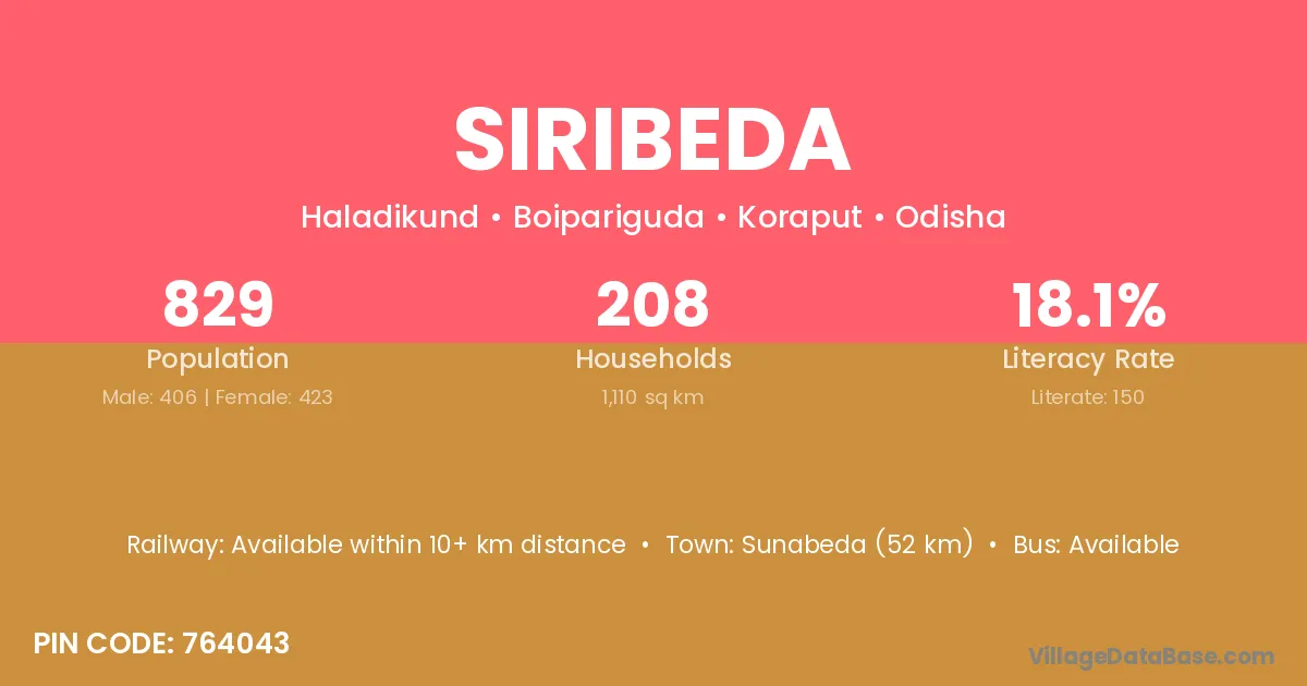 Sunabeda (52 km) is the nearest town to Siribeda village for major economic activities and is located approximately 52 km away.