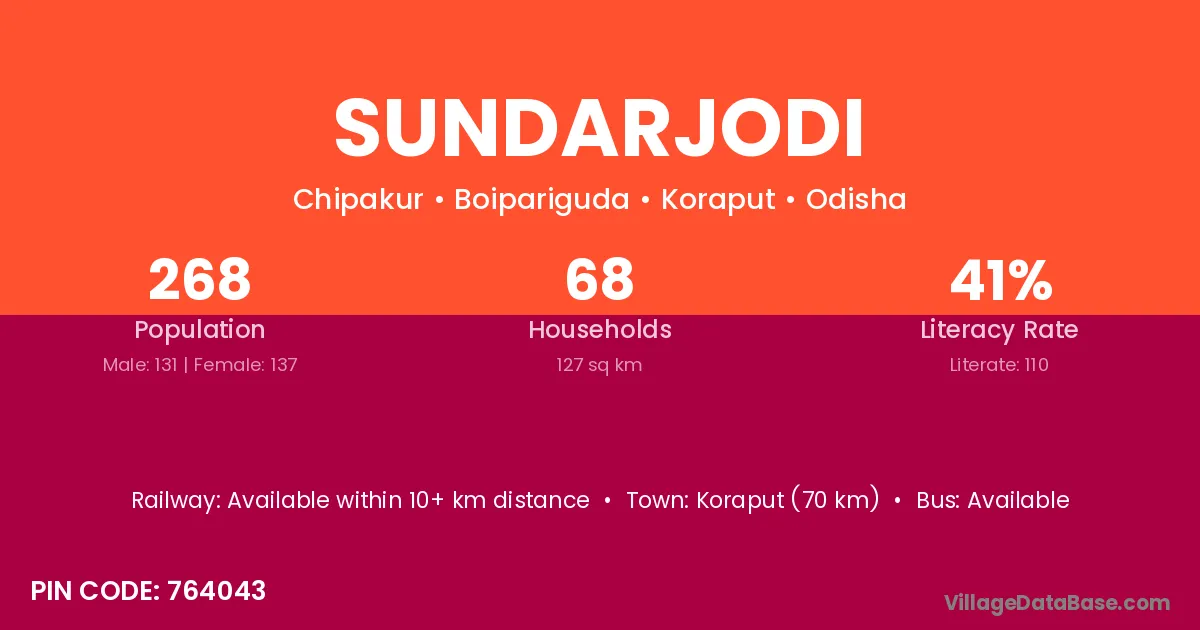 Koraput (70 km) is the nearest town to Sundarjodi village for major economic activities and is located approximately 70 km away.