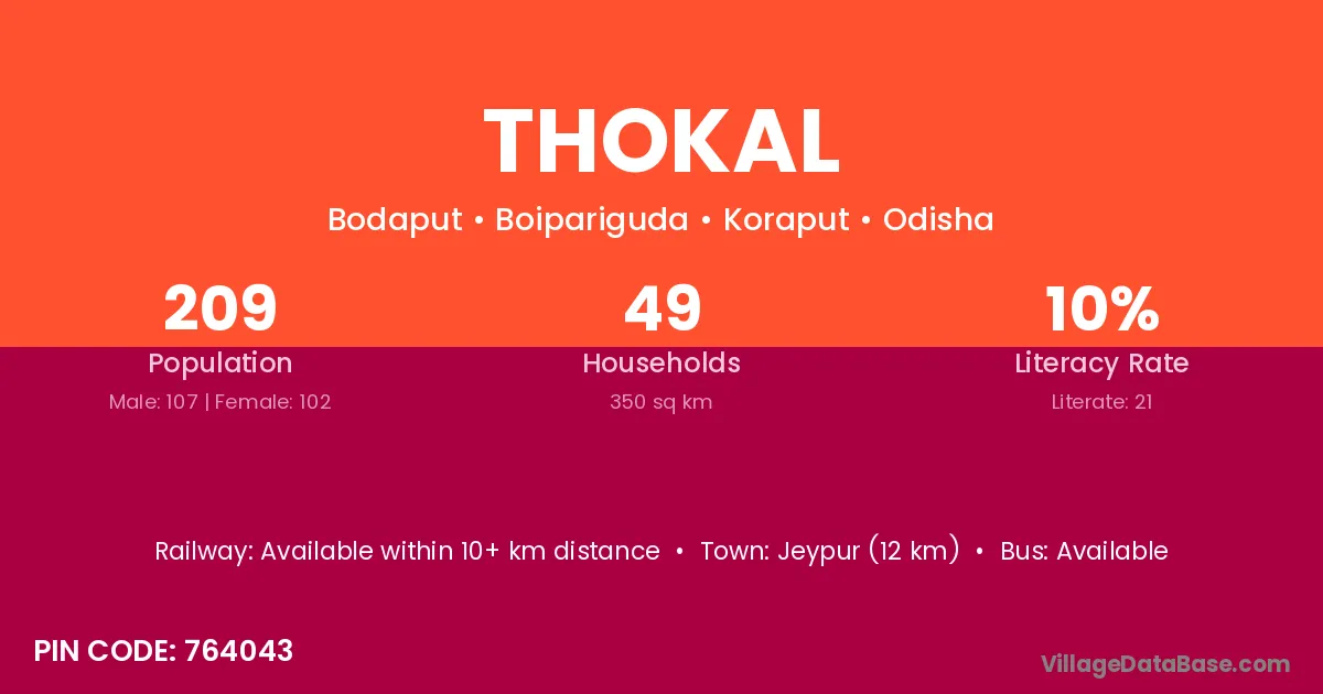 Jeypur (12 km) is the nearest town to Thokal village for major economic activities and is located approximately 12 km away.