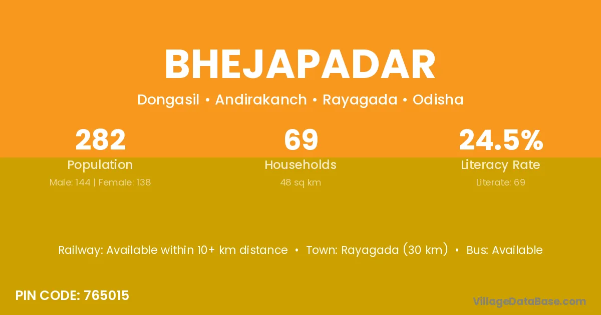 Kotpad (21 km) is the nearest town to Bhejapadar village for major economic activities and is located approximately 21 km away.
