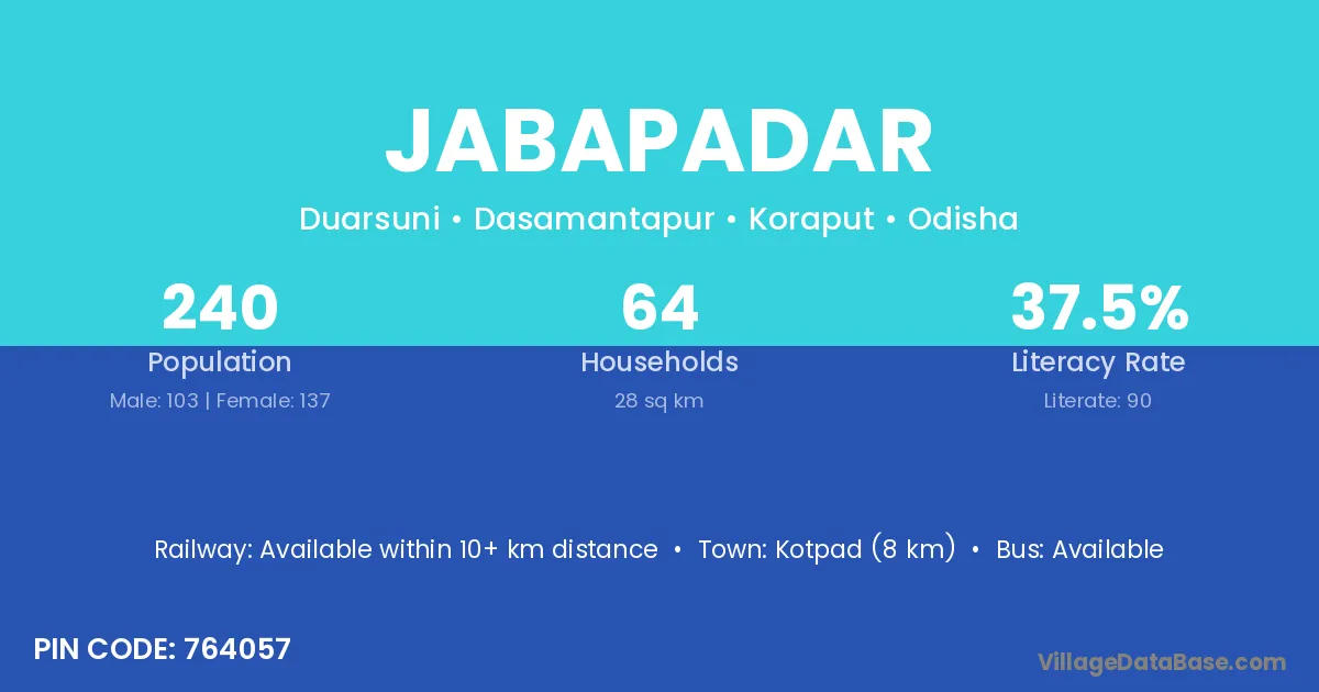Kotpad (8 km) is the nearest town to Jabapadar village for major economic activities and is located approximately 8 km away.
