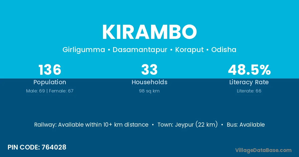 Jeypur (22 km) is the nearest town to Kirambo village for major economic activities and is located approximately 22 km away.
