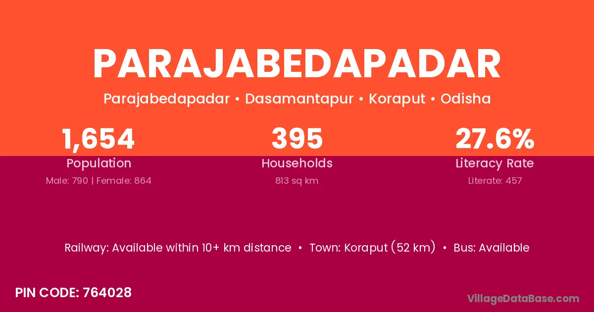 Koraput (52 km) is the nearest town to Parajabedapadar village for major economic activities and is located approximately 52 km away.