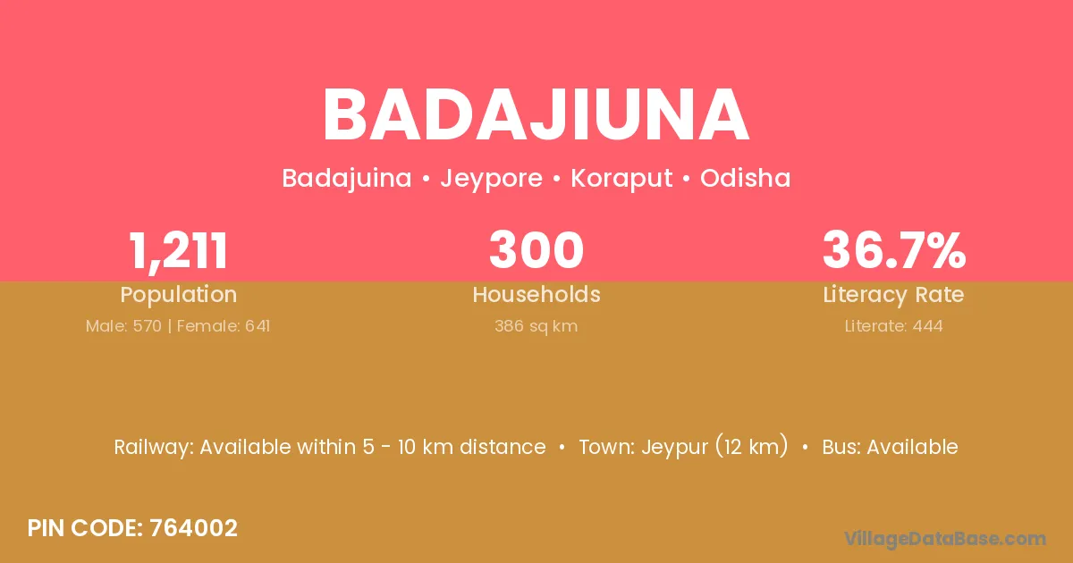 Jeypur (12 km) is the nearest town to Badajiuna village for major economic activities and is located approximately 12 km away.