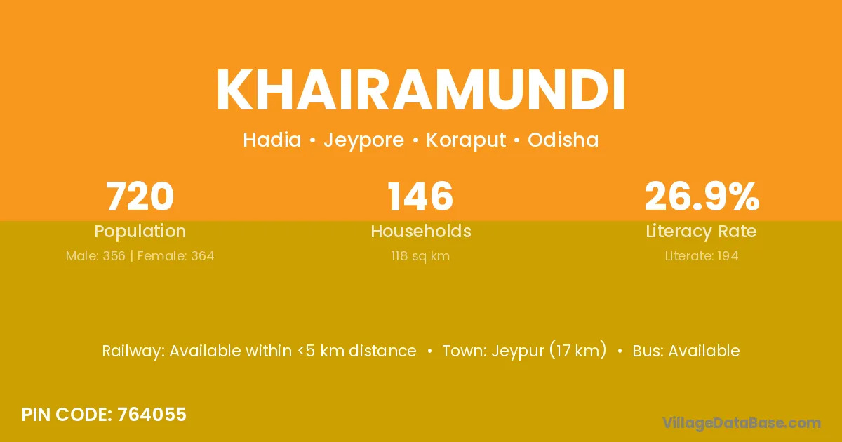 Jeypur (17 km) is the nearest town to Khairamundi village for major economic activities and is located approximately 17 km away.