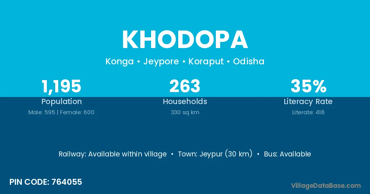 Jeypur (30 km) is the nearest town to Khodopa village for major economic activities and is located approximately 30 km away.
