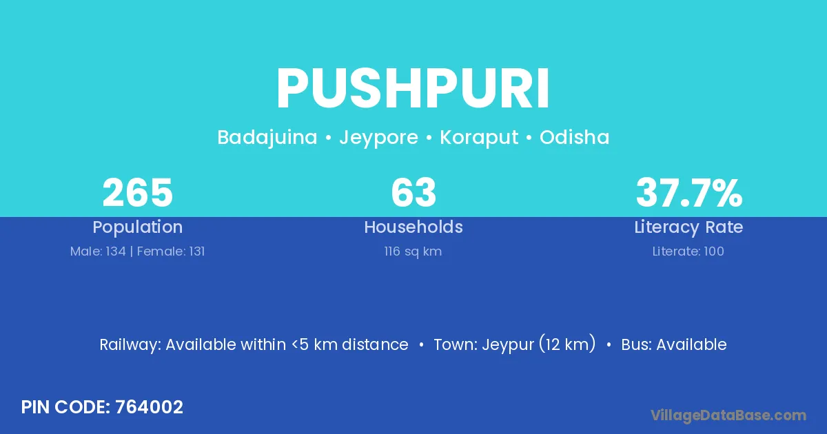 Jeypur (12 km) is the nearest town to Pushpuri village for major economic activities and is located approximately 12 km away.