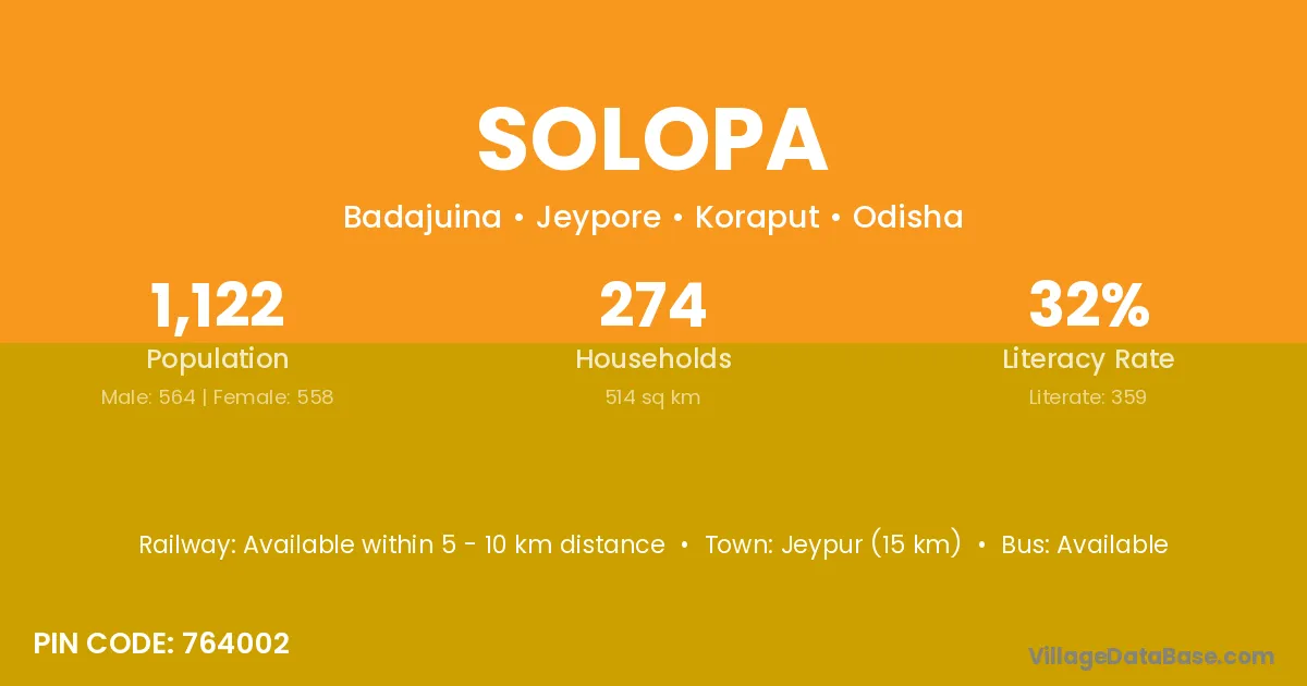 Jeypur (15 km) is the nearest town to Solopa village for major economic activities and is located approximately 15 km away.