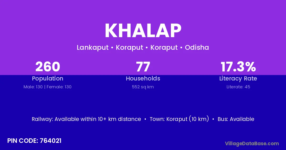 Koraput (10 km) is the nearest town to Khalap village for major economic activities and is located approximately 10 km away.