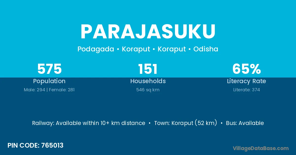 Koraput (52 km) is the nearest town to Parajasuku village for major economic activities and is located approximately 52 km away.