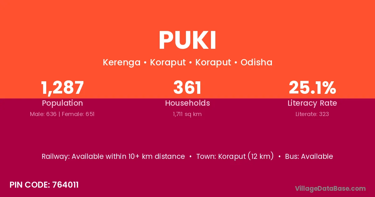 Koraput (12 km) is the nearest town to Puki village for major economic activities and is located approximately 12 km away.